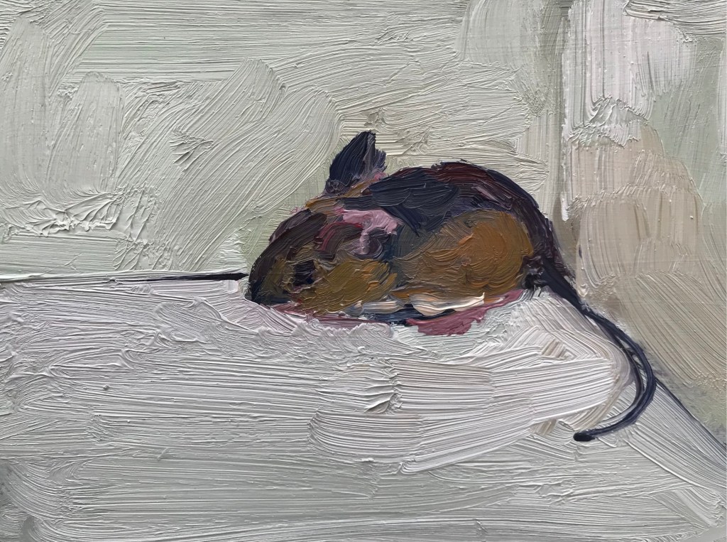 Lizzie, being an eccentric artist, decided to start catching the mice… and painting them. She’d put these long tubes – like massive, transparent Pez-dispensers – about the place and capture the poor little buggers. Then she’d put them in a cardboard box, paint them… and sell the paintings to her rich London friends who don’t have to worry about mice themselves – and like to be reminded of this by looking at paintings of them.