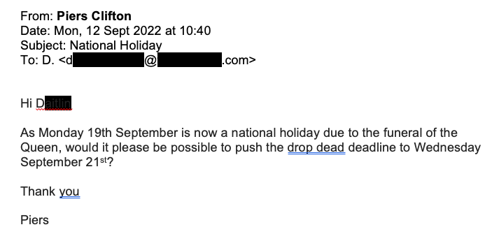 I’ve mentioned ‘funeral of the Queen’ and ‘drop dead deadline’ in the same sentence!
