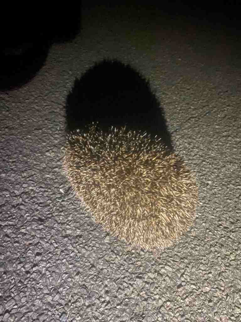 I panic. Clearly I can’t leave the hedgehog where it is, in the middle of the road. It’ll be hedgehog pizza, before you know it! But it’s not giving the slightest indication it’s planning to move. What can I do?